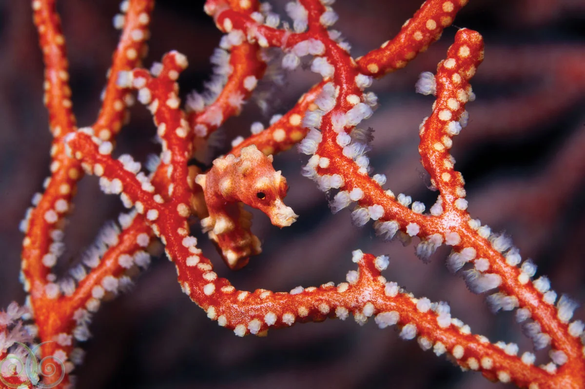 As you drift north through the channel, the topography shifts from a gentle slope to steep wall, festooned with colourful soft corals, huge gorgonian sea fans, and sea squirts and tunicates in a multitude of sizes and shapes. Careful inspection of the many rocky outcroppings, coral bommies, and overhangs is always rewarded with a treasure. A close look at Muricella and Annella sea fans often reveals the elusive Bargibanti and Denise pygmy seahorses. Large and colourful crinoids often cling to the fans as well, hosting a menagerie of colour-coordinated cling fish, crinoid shrimp, and arrowhead crabs.